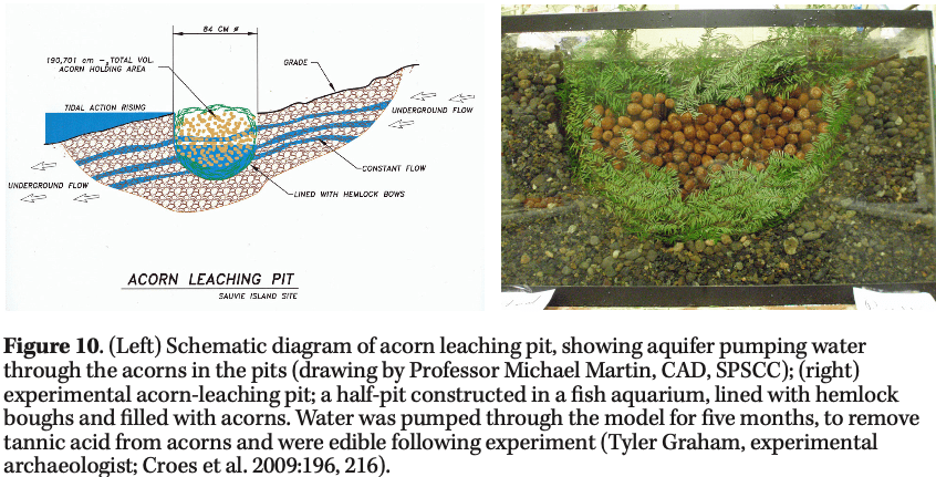 The technique of passive leaching observed at the Sunken Village Archaeological Site continues to be recognized by tribes today. For instance, the Siletz of western Oregon still refers to acorns leached in stream banks for several months to a year as ‘tusxa’, and acorns are still gathered, stored, and eaten by people living there. Tribal members from Siletz, Grand Ronde, and Warm Springs tell stories of mashing acorns to create a common soup or stew stock.
