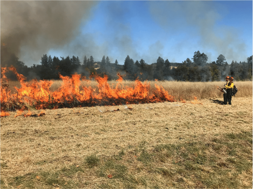 Top photo: Prescribed burn conducted by the Confederated Tribes of Grande Ronde at Champoeg Prairie to curb invasive plants and facilitate future harvest of culturally important plants like camas. Photo credit: Andy Neill, Institute for Applied Ecology.