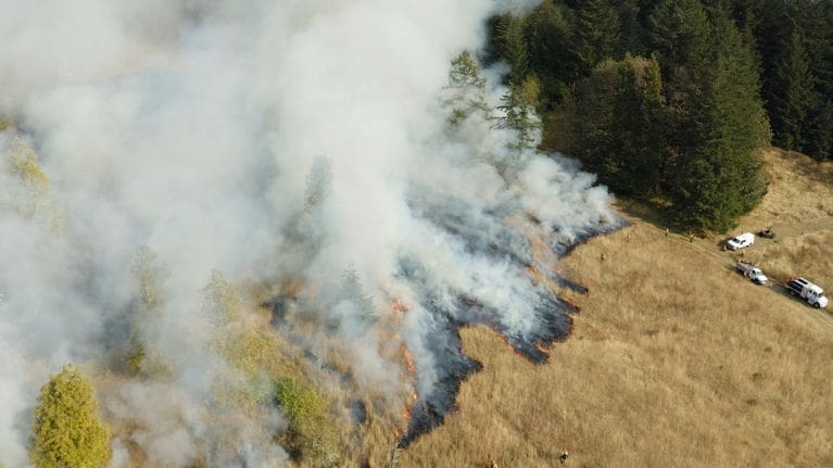 Left photo: The Confederated Tribes of Grand Ronde using controlled fire to clear brush and manage the landscape in the Willamette Valley in September 2022. Photo credit: Michael Sherman / OPB