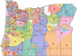 The peaks of the Tualatin Mountain range (Portland’s West Hills) create a watershed boundary on the landscape – to their west, water flows downhill and downstream into the Tualatin River which joins the Willamette River south of West Linn, and is covered by the Tualatin River Watershed Council. On the east side of the Tualatin Mountains, water flows into smaller tributaries which flow directly into the Willamette River; some waterways move through natural areas like Forest Park and Tryon Creek State Natural Area, others are piped underneath downtown Portland, or flow through urban, suburban, and rural areas. On the southern side of the Tualatin River’s confluence with the Willamette River, similar topography from the southern edge of the Chehalem Mountains divides the waterways which flow into the Tualatin River’s tributaries, versus those flowing directly into the Willamette River off slopes like Parrett Mountain. Along this 42-mile stretch of the Willamette River, there are about fifty confluence points from smaller waterways, and the majority of this area is uncovered by a watershed council.