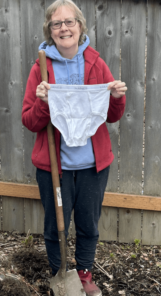 Why undies? Cotton is made of cellulose, which soil organisms love to break down. When you bury a pair of cotton undies, microorganisms in the soil start feasting on them. The healthier the soil, the more decomposition will occur. After about two months, the level of degradation in the undies shows us just how active and healthy our soil community is!