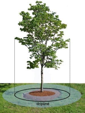 - To encourage roots to grow outwards, avoid watering young trees too close to its trunk and stick to watering over the root zone between the trunk and the edge of its leafy canopy (dripline). This will expand the young tree’s drip line over the coming years.